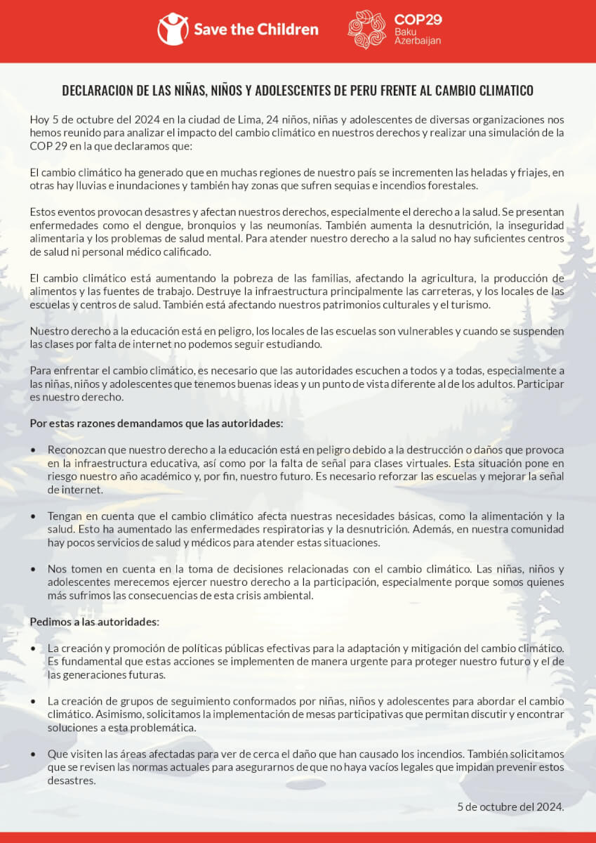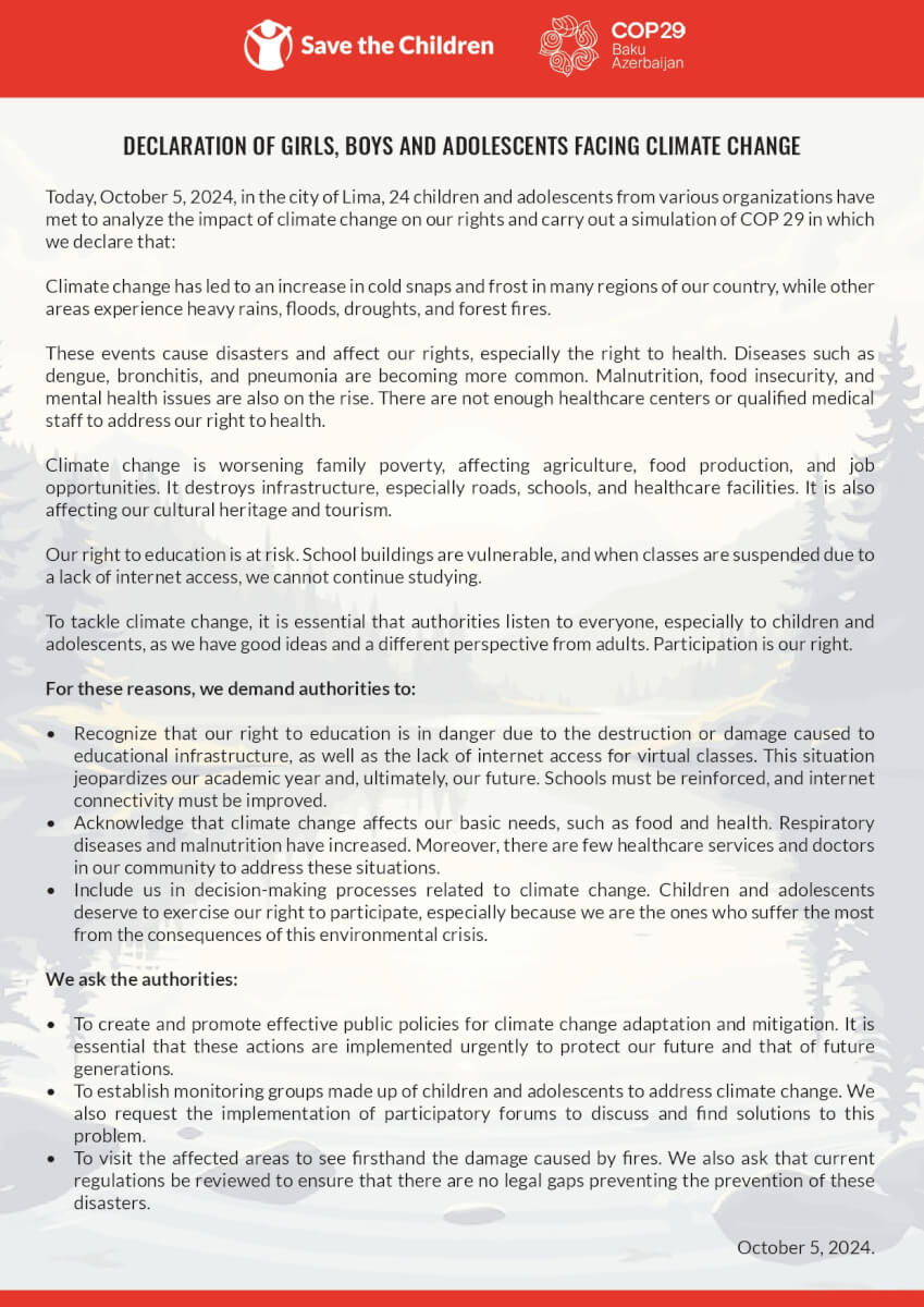 This declaration is the outcome of the COP Simulation, co-organized with our partner Acción por los Niños, where children had a platform to freely express their concerns and urgent demands regarding climate change.