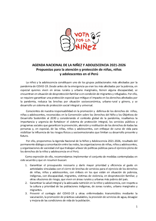 La Agenda Nacional de la Niñez y Adolescencia 2021-2026 es el resultado del permanente diálogo y concertación entre las redes, las organizaciones de niñas, niños y adolescentes, y organizaciones de sociedad civil que trabajan a favor de políticas públicas para el ejercicio pleno de los derechos de la niñez y adolescencia en el Perú.
